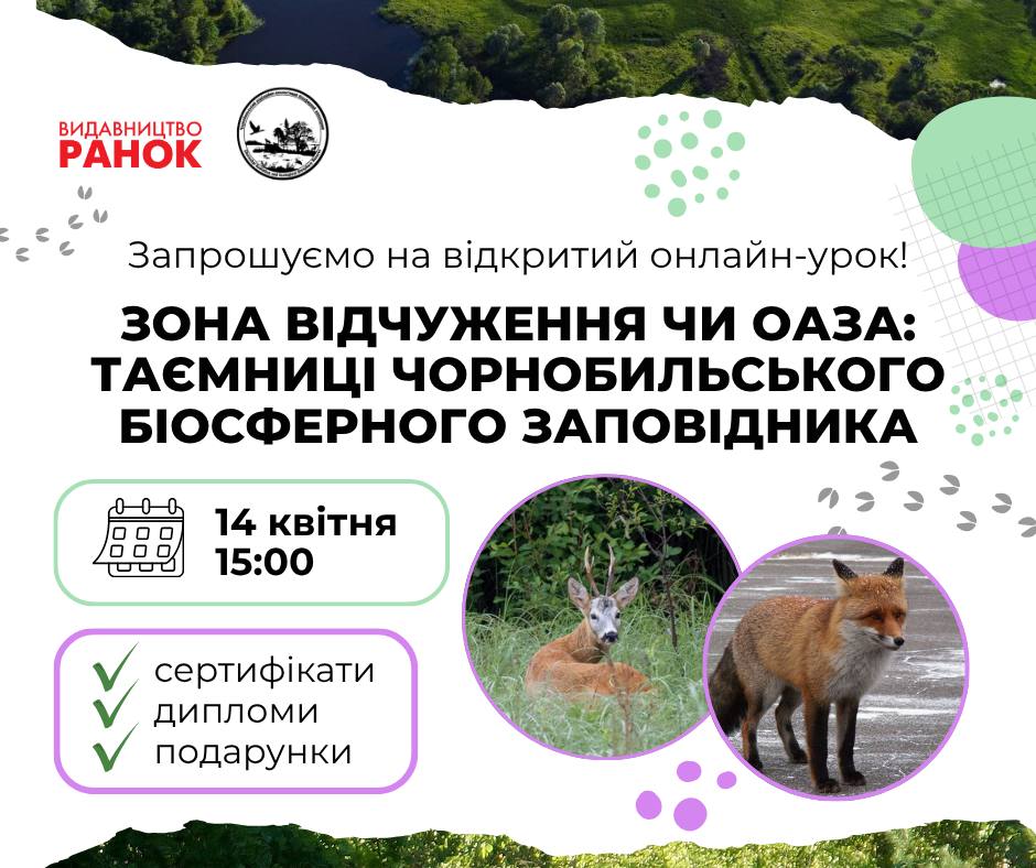 З нагоди 40-річчя Чорнобильська катастрофа видавництво видавництво «Ранок» спільно з Чорнобильським біосферним заповідником запрошують педагогічних працівників, батьків та учнів до участі у відкритому онлайн-уроці: «Зона відчуження чи оаза: таємниці Чорнобильського біосферного заповідника». Дата проведення: 14 квітня 2026 року. Час: 15:00. Формат: онлайн. У програмі заходу: ознайомлення з історією створення Чорнобильського біосферного заповідника; аналіз сучасного стану …