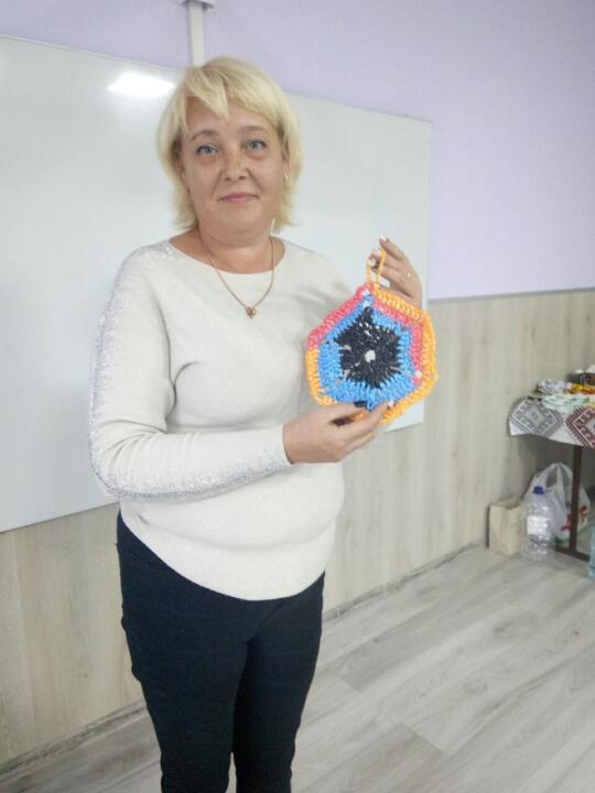 Практична робота була не менш цікавою та насиченою. У наші дні мистецтво в’язання гачком продовжує розвиватися, збагачуючи новими ідеями, композиційними прийомами, сучасними матеріалами. Несподіванкою для майстринь стало в’язання із поліетиленових сміттєвих пакетів, та, як цей матеріал, що засмічує світ, можна перетворити в унікальні та практичні речі – підставки для чашки, коврики для ванної кімнати, корзини для білизни, капці тощо.