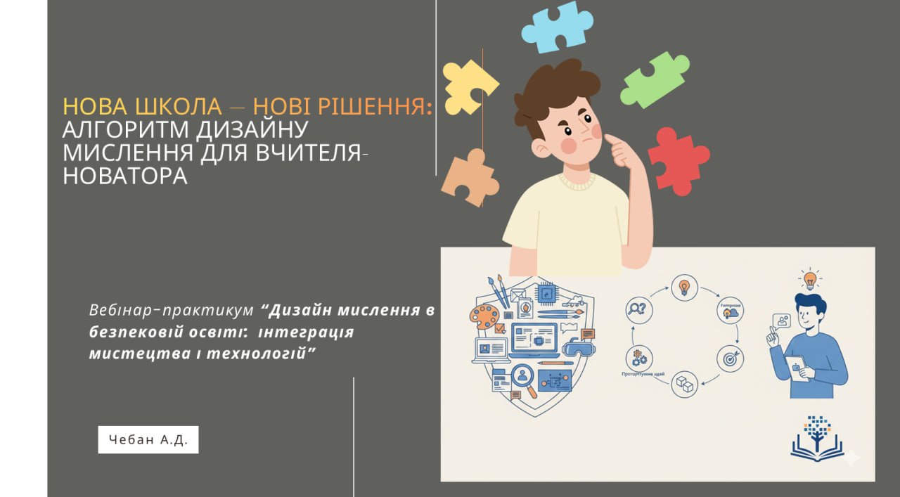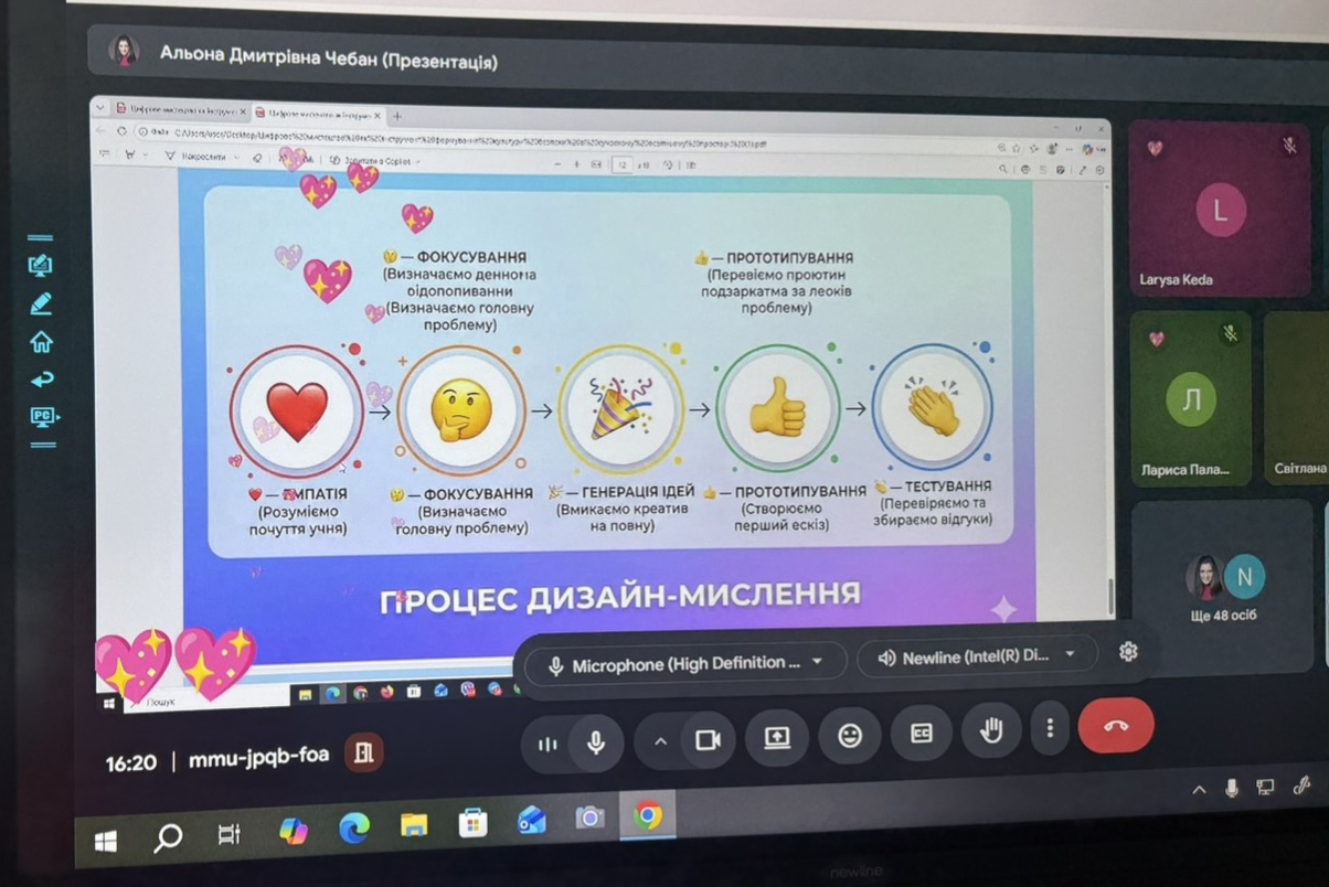 Альона Чебан, методист інституту представила алгоритм дизайн-мислення для вчителя-новатора: емпатія → визначення проблеми → генерація ідей → прототипування → тестування.