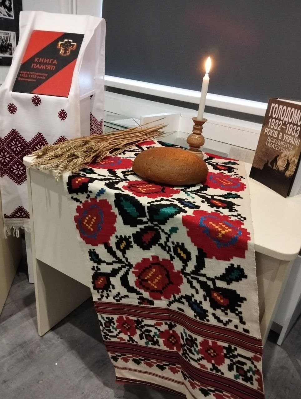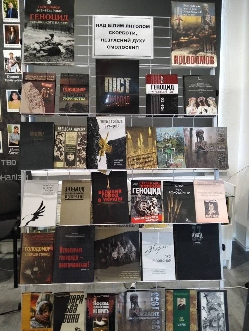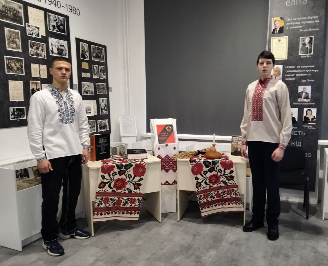 Крім того, студенти ознайомилися з тематичною виставкою–інсталяцією «Над білим янголом скорботи – незгасний духу смолоскип», яку підготували Валентина Суткова, завідувач бібліотеки, та Віра Веровенко, бібліотекар КНЗ КОР «Київський обласний інститут післядипломної освіти педагогічних кадрів». На виставці представлено видання про геноцид української нації, спогади і свідчення очевидців, тих, хто у своїй пам’яті крізь роки проніс страждання та біль спричинені тоталітарним режимом, дослідження науковців, краєзнавців, місцевих письменників, учителів і учнів закладів загальної середньої освіти про наслідки голодомору на території Київської області.