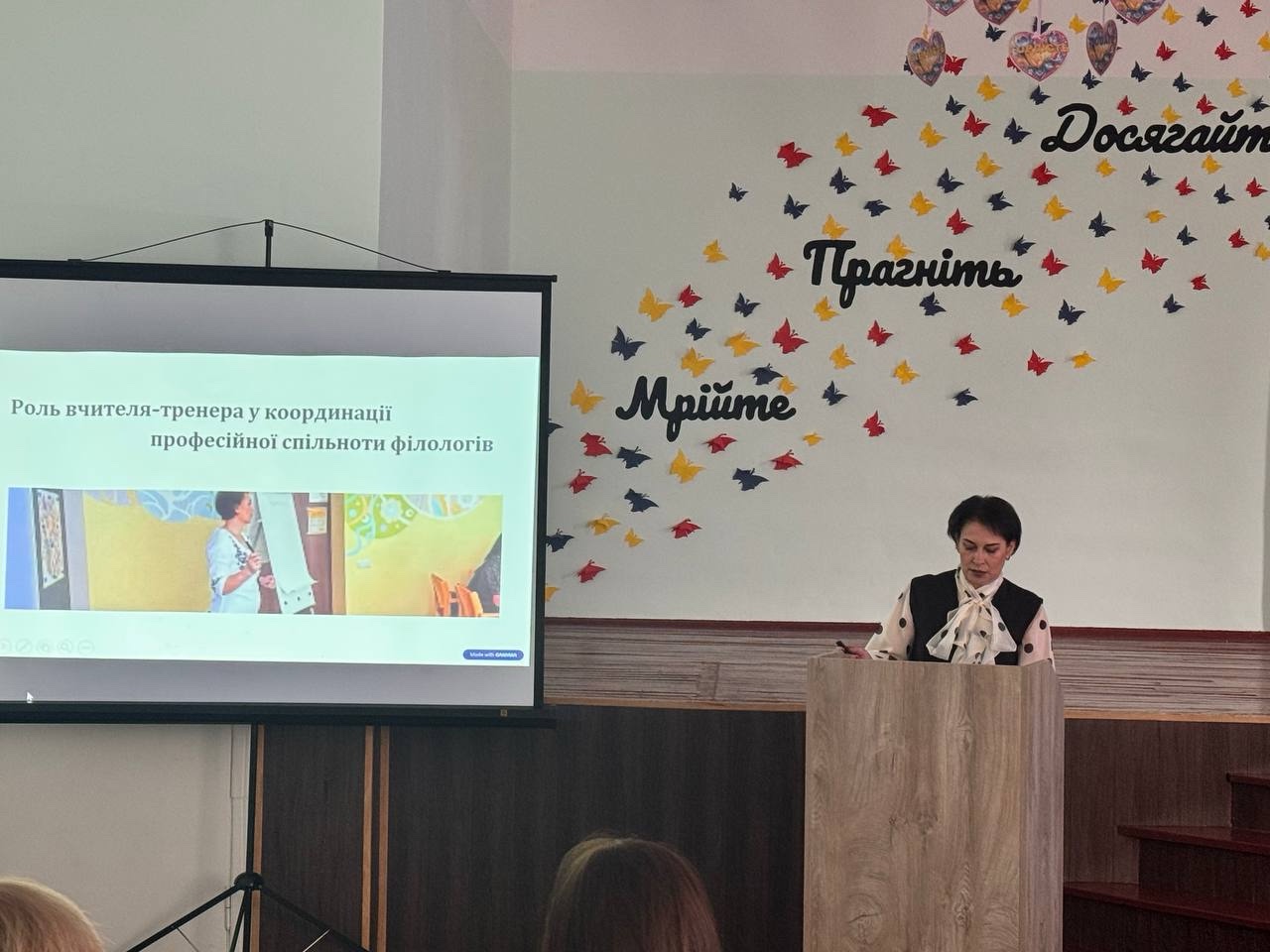 Олена Ткаченко, вчитель англійської мови Синявського ліцею, -презентувала роль учителя-тренера у координації професійних спільнот.