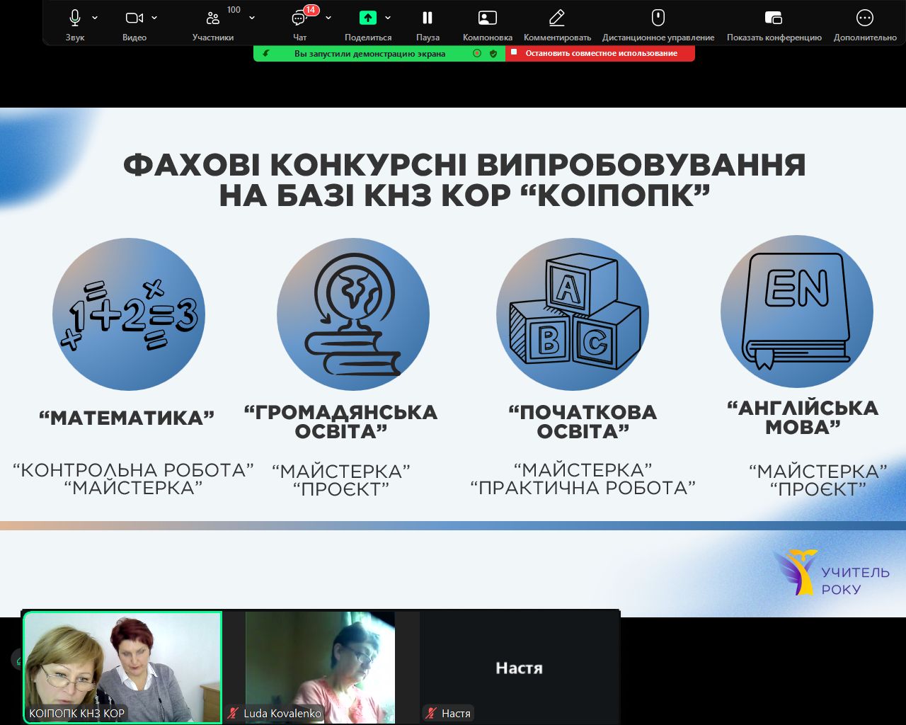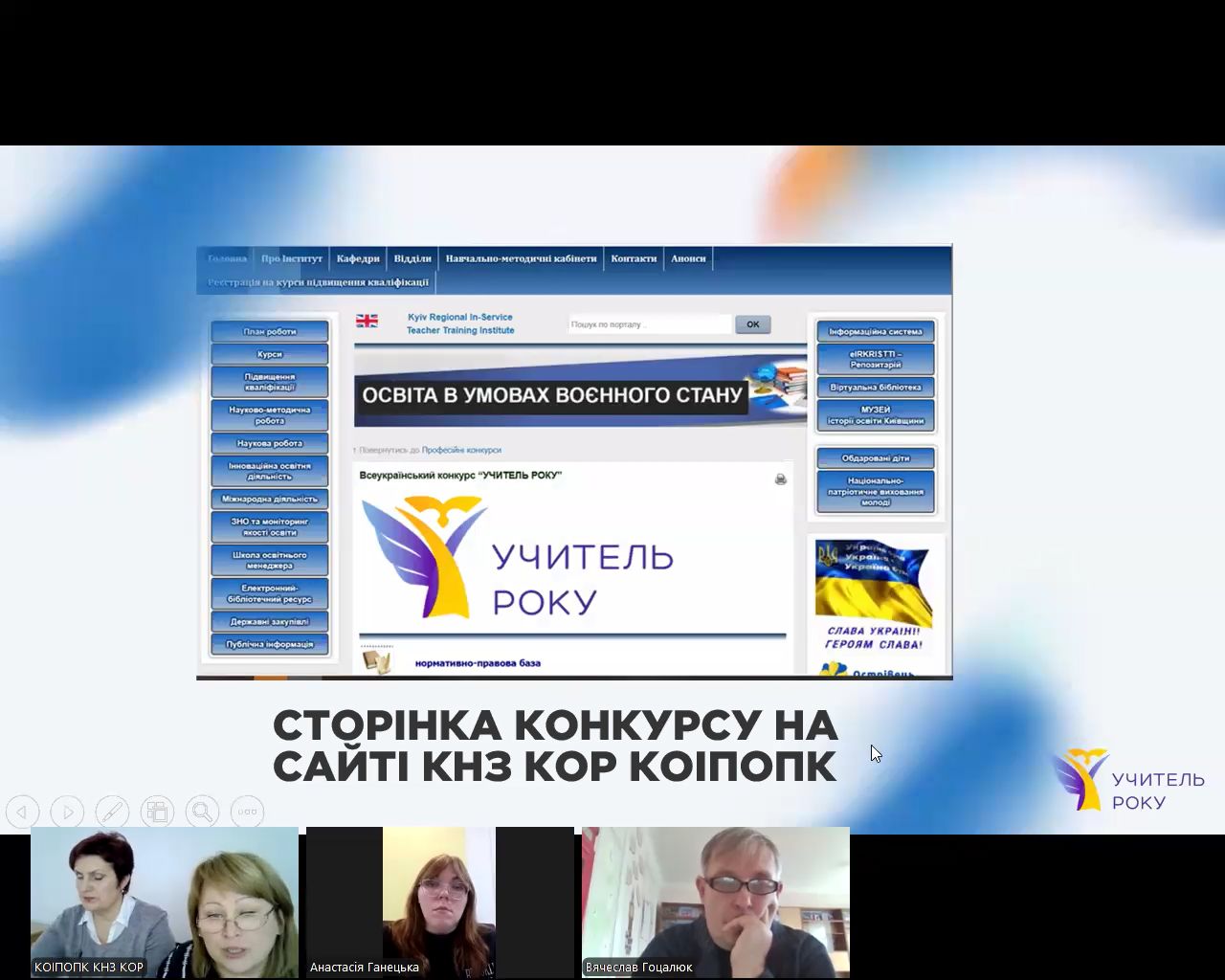 Професійна спільнота Київщини активно розпочала шлях до визначення найкращих педагогів України! Завідувач та методист навчально-методичного кабінету «Науково-методичний центр професійного розвитку» КНЗ КОР «Київський обласний інститут післядипломної освіти педагогічних кадрів» — Тетяна Якубовська та Тетяна Солдатенко — організували змістовну онлайн-зустріч для освітян, які цьогоріч долучилися до всеукраїнського конкурсу «Учитель року – 2026».