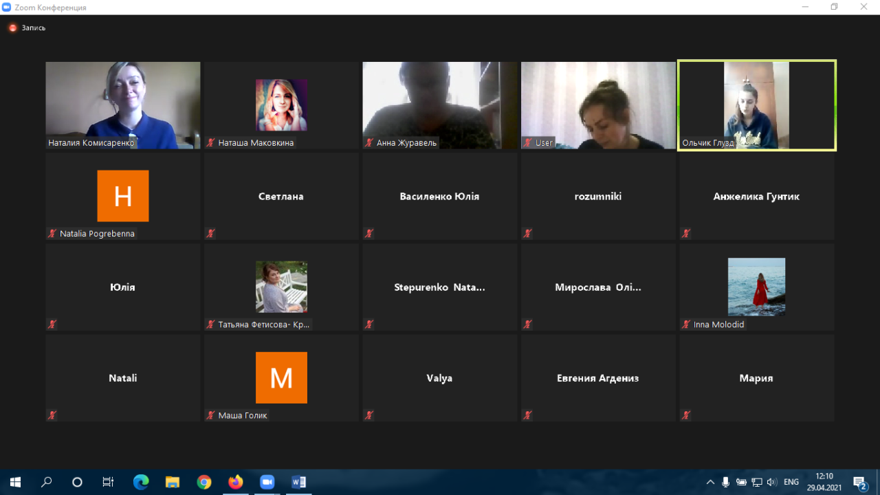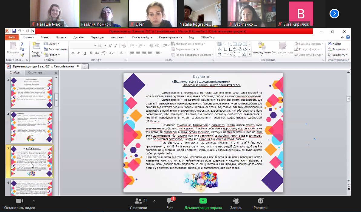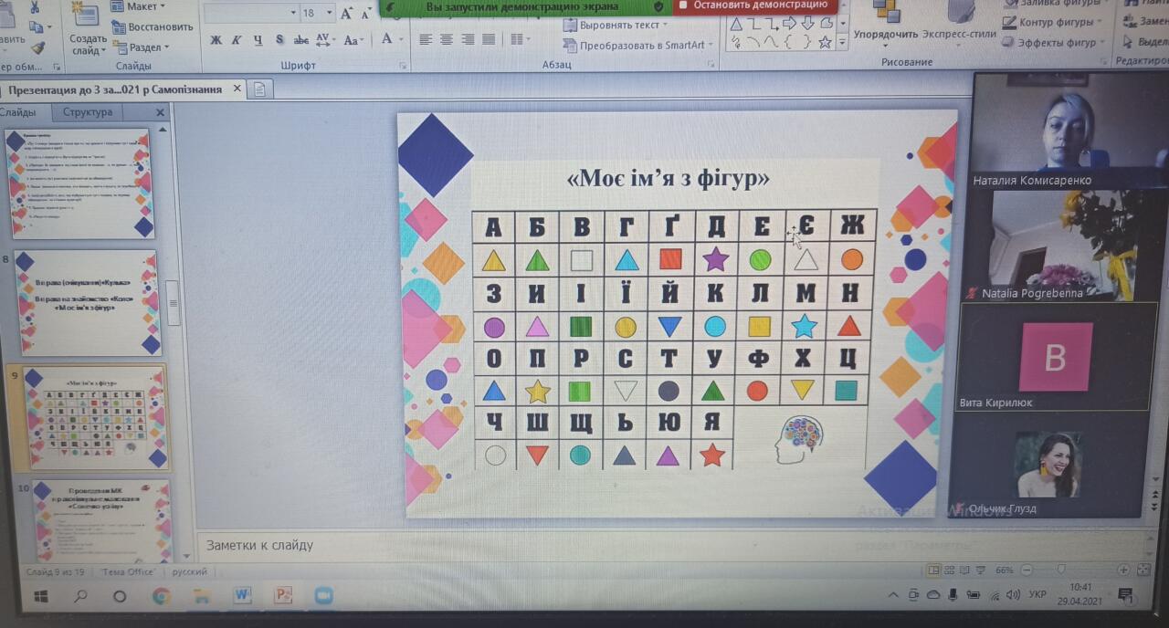 29 квітня в онлайн режимі на платформі Zoom проведене третє заключне заняття на тему: «Від мистецтва до самопізнання», обласного майстер-класу для практичних психологів та соціальних педагогів «Самопізнання засобами правопівкуного малювання», Маковкіна Н.О., координатор МК, завідувач відділом практичної психології і соціальної роботи, Комісаренко Н. В., керівник МК, практичний психолог.